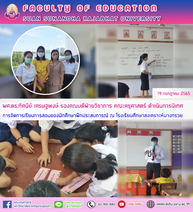 วันที่ 19 กรกฎาคม 2565 ผู้ช่วยศาสตราจารย์ ดร.ทัศนีย์ เศรษฐพงษ์ รองคณบดีฝ่ายวิชาการ คณะครุศาสตร์ มหาวิทยาลัยราชภัฏสวนสุนันทา ดำเนินการนิเทศการจัดการเรียนการสอนของนักศึกษาฝึกประสบการณ์ ณ โรงเรียนศึกษาสงเคราะห์บางกรวย จังหวัดนนทบุรี