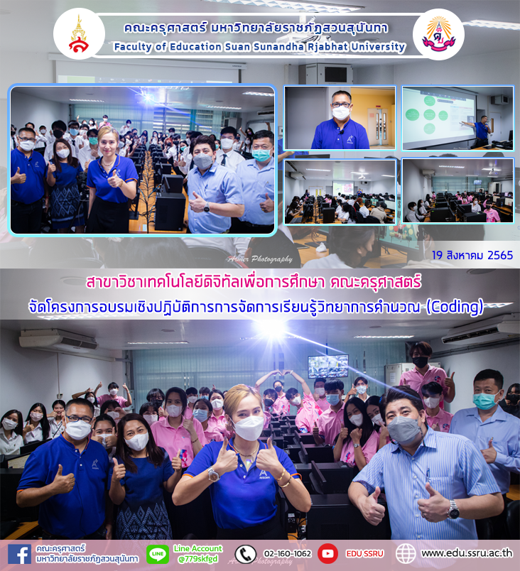 วันที่ 19 สิงหาคม 2565 สาขาวิชาเทคโนโลยีดิจิทัลเพื่อการศึกษา คณะครุศาสตร์ มหาวิทยาลัยราชภัฏสวนสุนันทา จัดโครงการอบรมเชิงปฏิบัติการการจัดการเรียนรู้วิทยาการคำนวณ (Coding) กระบวนการคิดเชิงคำนวณเพื่อสนับสนุนการ Coding ให้กับเยาวชน โดยได้รับเกียรติจาก คุณปิยะวัฒน์ วัฒนา มาเป็นวิทยากรในการบรรยาย ณ ห้องปฏิบัติการคอมพิวเตอร์ 1121 และ 1122 อาคาร 11 คณะครุศาสตร์