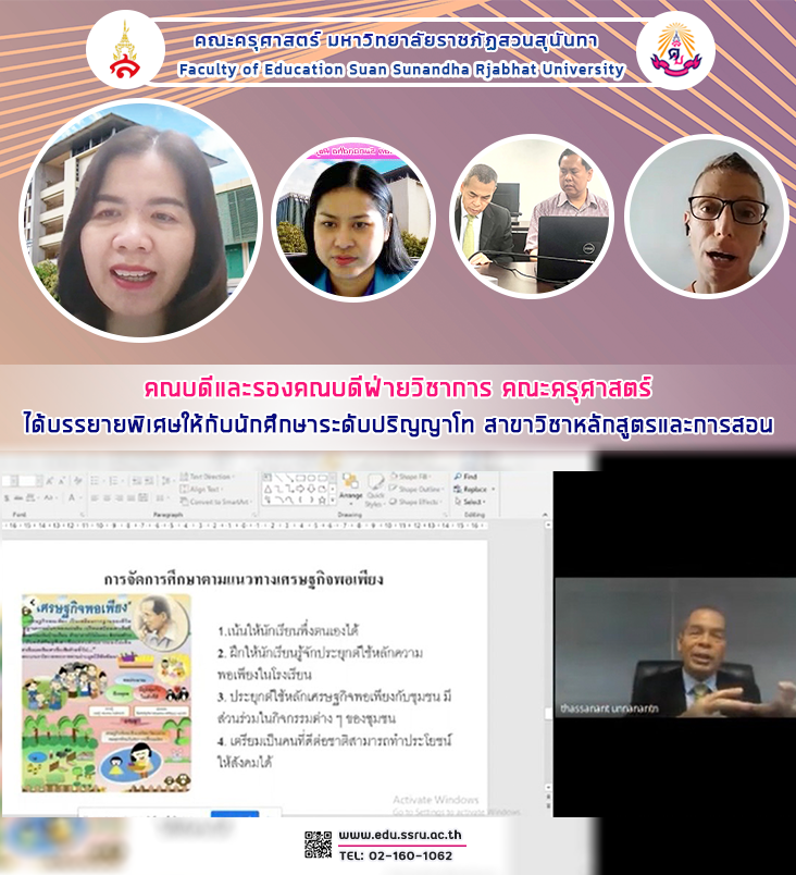 เมื่อวันที่ 17 ธันวาคม 2565 ผู้ช่วยศาสตราจารย์ ดร.กรรณิการ์ ภิรมย์รัตน์ คณบดีคณะครุศาสตร์ มหาวิทยาลัยราชภัฏสวนสุนันทา เป็นประธานในการบรรยายพิเศษให้แก่นักศึกษาระดับปริญญาโทสาขาวิชาหลักสูตรและการสอน โดยการบรรยายดังกล่าวจัดขึ้นโดยผู้ช่วยศาสตราจารย์ ดร.ทัศนีย์ เศรษฐพงษ์ รองคณบดีฝ่ายวิชาการ และอาจารย์ ดร.ธรรศนันต์ อุนนะนันทน์ หัวหน้าสาขาวิชาภาษาอังกฤษ และได้รับเกียรติจาก พลตรี ดร. วัชรวิทย์ ณรงค์พันธุ์ รองผู้อำนวยการสำนักอำนวยการข่าวกรอง กอ.รมน. ภาค 4 ส่วนหน้า เป็นวิทยากรบรรยายหัวข้อ หลักเศรษฐกิจพอเพียง : ศาสตร์และศิลป์ในการประยุกต์ใช้ ผ่านระบบออนไลน์ Google Meet