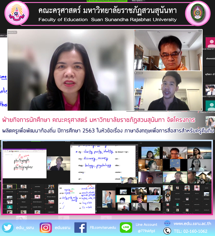 วันที่ 20 เมษายน 2564 นำโดย ผู้ช่วยศาสตราจารย์ สงกรานณ์ ขุนทิพย์ทอง รองคณบดีฝ่ายกิจการนักศึกษา คณะครุศาสตร์ มหาวิทยาลัยราชภัฏสวนสุนันทา จัดโครงการผลิตครูเพื่อพัฒนาท้องถิ่น ปีการศึกษา 2563 ผ่านระบบออนไลน์ ในหัวข้อเรื่อง ภาษาอังกฤษเพื่อการสื่อสารสำหรับครูคืนถิ่น ผ่านระบบออนไลน์ โดยได้รับเกียรติจาก ผู้ช่วยศาสตราจารย์ ดร.กรรณิการ์ ภิรมย์รัตน์ คณบดีคณะครุศาสตร์ กล่าวเปิดโครงการ และ อาจารย์ณัฐพล เปรมจิตต์ เป็นวิทยากร