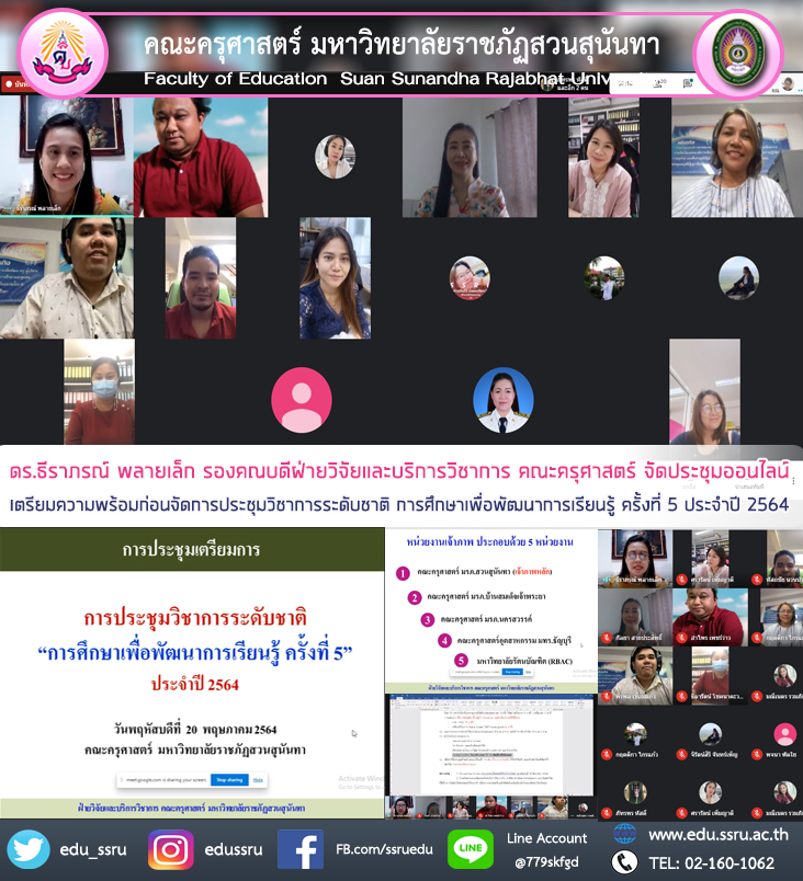 วันที่ 20 พฤษภาคม 2564 ดร.ธีราภรณ์ พลายเล็ก รองคณบดีฝ่ายวิจัยและบริการวิชาการ คณะครุศาสตร์ มหาวิทยาลัยราชภัฏสวนสุนันทา จัดประชุมออนไลน์เตรียมความพร้อมก่อนจัดการประชุมวิชาการระดับชาติ การศึกษาเพื่อพัฒนาการเรียนรู้ ครั้งที่ 5 ประจำปี 2564