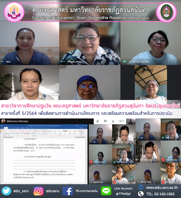วันที่ 20 พฤษภาคม 2564 สาขาวิชาการศึกษาปฐมวัย คณะครุศาสตร์ มหาวิทยาลัยราชภัฏสวนสุนันทา จัดประชุมออนไลน์สาขาครั้งที่ 5/2564 เพื่อติดตามการดำเนินงานโครงการ และเตรียมความพร้อมสำหรับการประเมิน