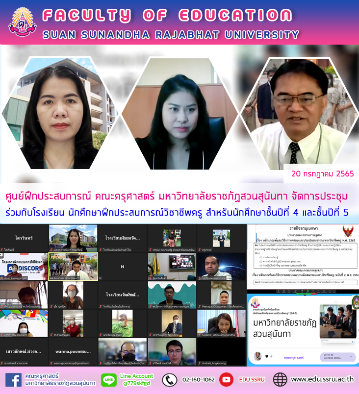 วันที่ 20 กรกฎาคม 2565 เวลา 10.00 - 12.00 น. ศูนย์ฝึกประสบการณ์ นำโดย ผู้ช่วยศาสตราจารย์ ดร.กรรณิการ์ ภิรมย์รัตน์ คณบดี พร้อมด้วย ผู้ช่วยศาสตราจารย์ ดร.ทัศนีย์ เศรษฐพงษ์ รองคณบดีฝ่ายวิชาการ และผู้ช่วยศาสตราจารย์สงกรานณ์ ขุนทิพย์ทอง รองคณบดีฝ่ายกิจการนักศึกษา คณะครุศาสตร์ มหาวิทยาลัยราชภัฏสวนสุนันทาจัดการประชุมร่วมกับโรงเรียน นักศึกษาฝึกประสบการณ์วิชาชีพครู สำหรับนักศึกษาชั้นปีที่ 4 และชั้นปีที่ 5 เพื่อชี้แจงแบบประเมินนักศึกษาปฏิบัติการสอนในสถานศึกษา ผ่านระบบออนไลน์ Zoom