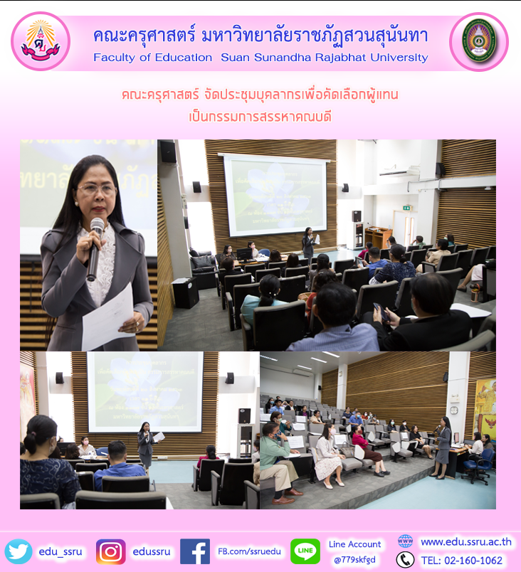 วันที่ 20 สิงหาคม 2563 รองศาสตราจารย์ ดร.นันทิยา น้อยจันทร์ คณบดีคณะครุศาสตร์ มหาวิทยาลัยราชภัฎสวนสุนันทา จัดประชุมบุคลากรเพื่อคัดเลือกผู้แทนเป็นกรรมการสรรหาคณบดี ณ ห้องประชุม 1137 ชั้น 3 คณะครุศาสตร์