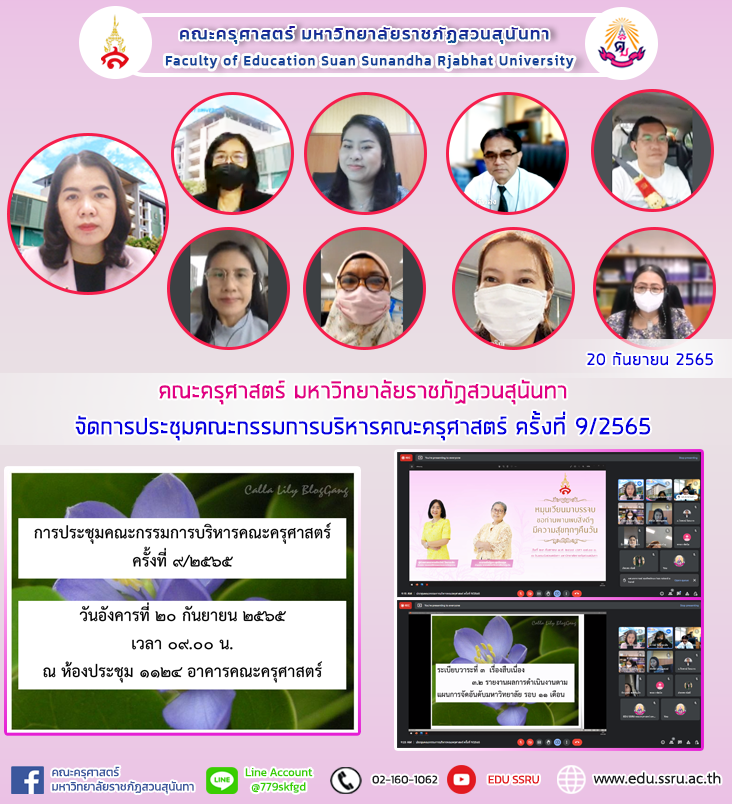 วันที่ 20 กันยายน 2565 เวลา 09.00 - 12.00 น. นำโดย ผู้ช่วยศาสตราจารย์ ดร.กรรณิการ์ ภิรมย์รัตน์ คณบดี พร้อมด้วยรองคณบดีทุกฝ่าย อาจารย์ ดร.ดวงกมล จงเจริญ ผู้อำนวยการศูนย์พัฒนาวิชาชีพทางการศึกษา ผู้ช่วยศาสตราจารย์ สุพันธ์วดี ไวยรูป ผู้อำนวยการศูนย์พัฒนาศักยภาพเด็กปฐมวัย และนางรวินันท์ พระยาน้อย หัวหน้าสำนักงาน คณะครุศาสตร์ มหาวิทยาลัยราชภัฏสวนสุนันทา จัดประชุมคณะกรรมการบริหารคณะครุศาสตร์ ครั้งที่ 9/2565 ผ่านระบบออนไลน์ Google Meet