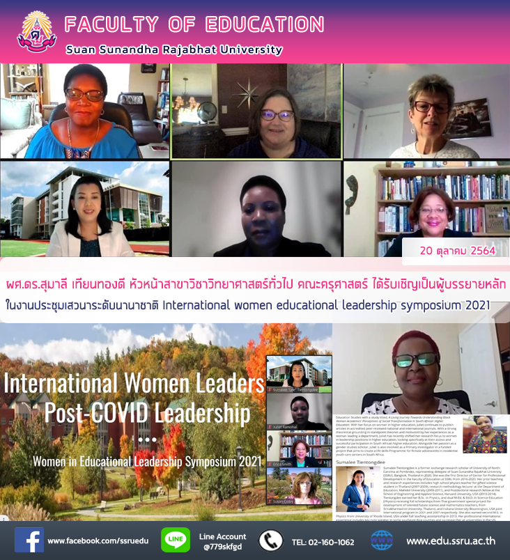 วันที่ 20 ตุลาคม 2564 ผู้ช่วยศาสตราจารย์ ดร.สุมาลี เทียนทองดี หัวหน้าสาขาวิชาวิทยาศาสตร์ทั่วไป คณะครุศาสตร์ มหาวิทยาลัยราชภัฏสวนสุนันทา ได้รับเชิญเป็นผู้บรรยายหลักในงานประชุมเสวนาระดับนานาชาติ International women educational leadership symposium 2021 ผ่านระบบการประชุมออนไลน์ หัวข้อ International women leader in Post-COVID leadership