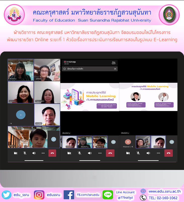 วันที่ 2 กุมภาพันธ์ 2564 ฝ่ายวิชาการ คณะครุศาสตร์ มหาวิทยาลัยราชภัฏสวนสุนันทา จัดอบรมออนไลน์ในโครงการพัฒนารายวิชา Online ระยะที่ 1 หัวข้อเรื่องการประเมินการเรียนการสอนในรูปแบบ E-Learning โดยแบ่งเป็น 3 กลุ่ม มี อาจารย์ ดร.ชุติวัฒน์ สุวัตถิพงศ์ ดร.ธนัทณัฏฐ์ ฉัตรภัครัตน์ อาจารย์ ดร.พัทธนันท์ บุตรฉุย อาจารย์ ดร.พันทิพา อมรฤทธิ์ จากสำนักเทคโนโลยีการศึกษา มหาวิทยาลัยสุโขทัยธรรมาธิราช รองศาสตราจารย์ เป็นวิทยากร
