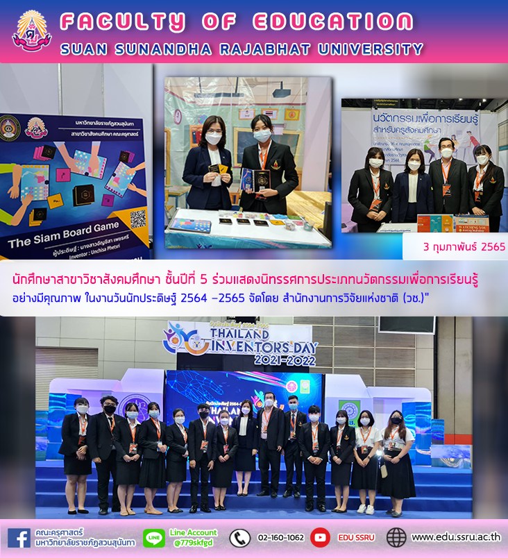 นักศึกษาสาขาวิชาสังคมศึกษา ชั้นปีที่ 5 คณะครุศาสตร์มหาวิทยาลัยราชภัฏสวนสุนันทา ร่วมแสดงนิทรรศการประเภทนวัตกรรมเพื่อการเรียนรู้อย่างมีคุณภาพ ในงานวันนักประดิษฐ์ 2564 -2565 จัดโดย สำนักงานการวิจัยแห่งชาติ (วช.) ระหว่างวันที่ 2-6 กุมภาพันธ์ 2565 ณ ศูนย์นิทรรศการและการประชุมไบเทค โดยเมื่อวันที่ 2 กุมภาพันธ์ 2565 ได้รับเกียรติจาก ผศ.ดร.กรรณิการ์ ภิรมย์รัตน์ คณบดีคณะครุศาสตร์ ร่วมชมผลงานการจัดนิทรรศการและให้กำลังใจกับนักศึกษา โดยมีอาจารย์วีรพจน์ รัตนวาร รองคณบดีฝ่ายบริหารและอาจารย์ที่ปรึกษาผลงานและนักศึกษา ร่วมถ่ายภาพเป็นที่ระลึก