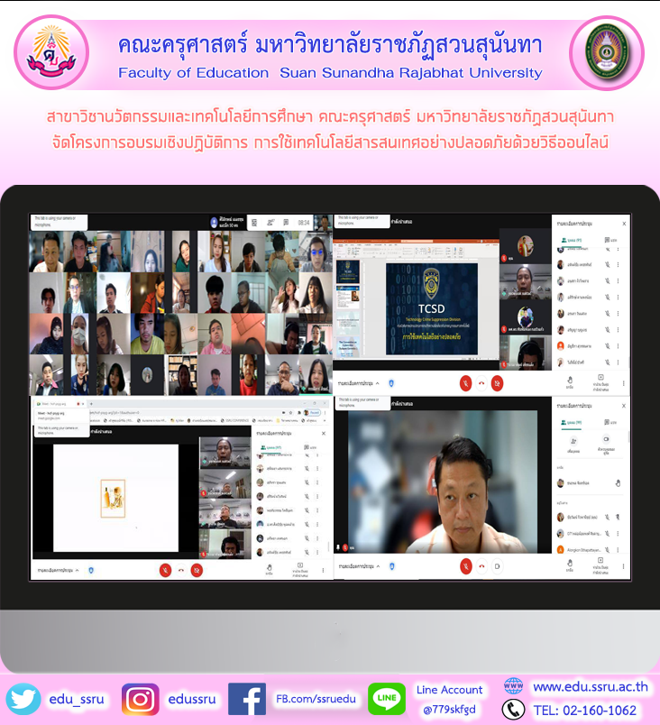 วันที่ 21 มกราคม 2564 สาขาวิชานวัตกรรมและเทคโนโลยีการศึกษา คณะครุศาสตร์ มหาวิทยาลัยราชภัฏสวนสุนันทา จัดโครงการอบรมเชิงปฏิบัติการ การใช้เทคโนโลยีสารสนเทศอย่างปลอดภัยด้วยวิธีออนไลน์ โดย คณบดี ผศ.ดร.กรรณิการ์ ภิรมรัตน์ ให้เกียรติ์เป็นประธานเปิดโครงการอบรมในครั้งนี้ โดยได้รับเกียรติจากคณะวิทยากรดังต่อไปนี้