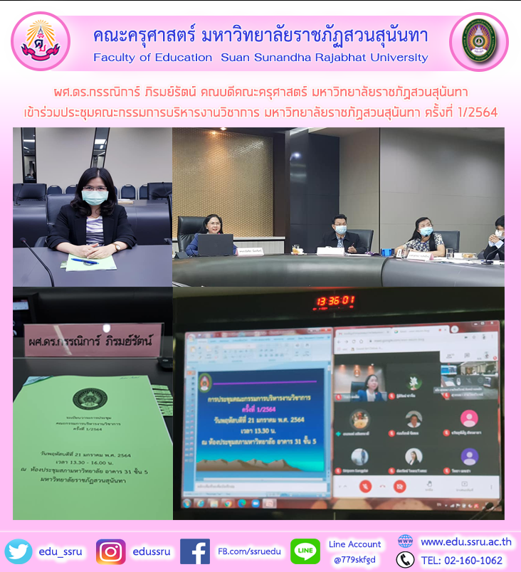 วันที่ 21 มกราคม 2564 ผู้ช่วยศาสตราจารย์ ดร.กรรณิการ์ ภิรมย์รัตน์ คณบดีคณะครุศาสตร์ มหาวิทยาลัยราชภัฏสวนสุนันทา เข้าร่วมประชุมคณะกรรมการบริหารงานวิชาการ มหาวิทยาลัยราชภัฏสวนสุนันทา ครั้งที่ 1/2564 ณ ห้องประชุมสภามหาวิทยาลัย อาคาร 31 ชั้น 5