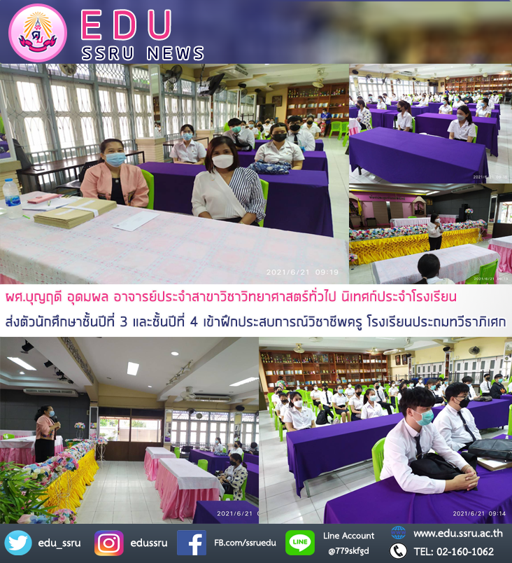 วันที่ 21 มิถุนายน 2564 ผู้ช่วยศาสตราจารย์ บุญฤดี อุดมผล อาจารย์ประจำสาขาวิชาวิทยาศาสตร์ทั่วไป คณะครุศาสตร์ มหาวิทยาลัยราชภัฏสวนสุนันทา นิเทศก์ประจำโรงเรียนส่งตัวนักศึกษาชั้นปีที่ 3 และชั้นปีที่ 4 เข้าฝึกประสบการณ์วิชาชีพครู ณ โรงเรียนประถมทวีธาภิเศก
