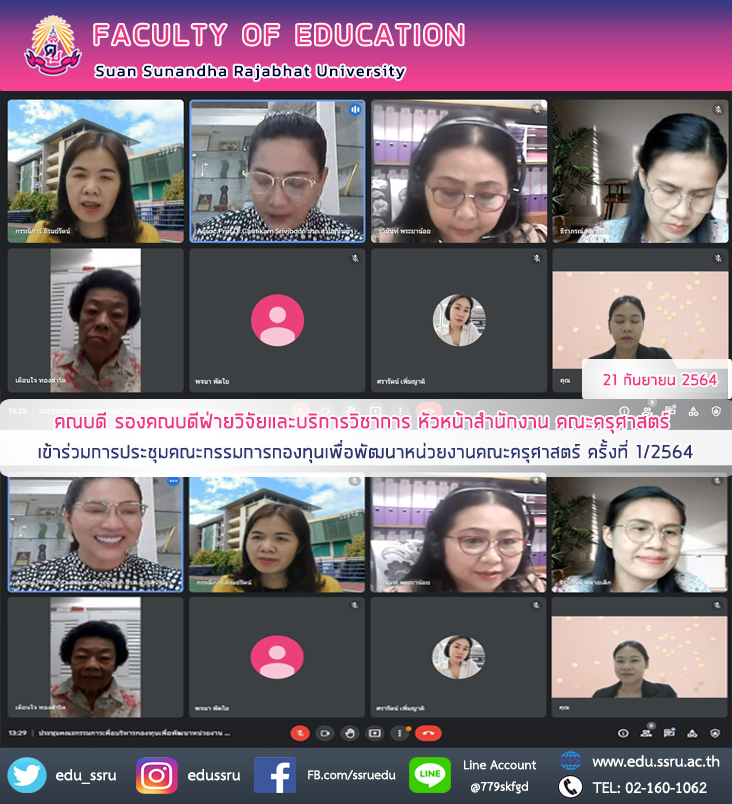 วันที่ 21 กันยายน 2564 ผู้ช่วยศาสตราจารย์ ดร.กรรณิการ์ ภิรมย์รัตน์ คณบดี อาจารย์ ดร.ธีราภรณ์ พลายเล็ก รองคณบดีฝ่ายวิจัยและบริการวิชาการ และ นางรวินันท์ พระยาน้อย หัวหน้าสำนักงาน คณะครุศาสตร์ มหาวิทยาลัยราชภัฏสวนสุนันทา เข้าร่วมการประชุมคณะกรรมการกองทุนเพื่อพัฒนาหน่วยงานคณะครุศาสตร์ ครั้งที่ 1/2564 โดยมี รองศาสตราจารย์ ดร.ชุติกาญจน์ ศรีวิบูลย์ อธิการบดีมหาวิทยาลัยราชภัฏสวนสุนันทา เป็นประธานในการประชุม