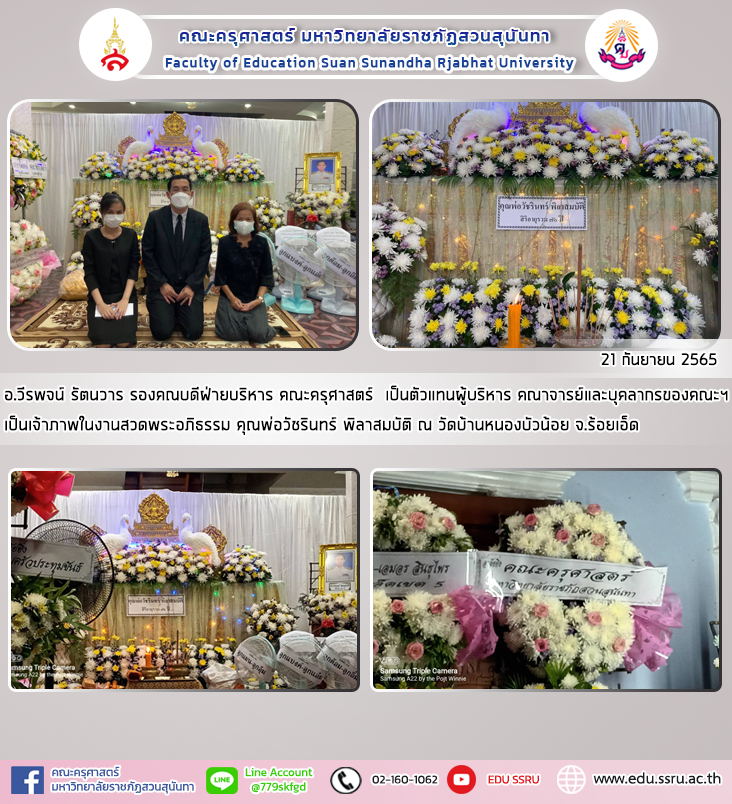 วันอังคารที่ 20 กันยายน 2565 ผู้ช่วยศาสตราจารย์ ดร.กรรณิการ์ ภิรมย์รัตน์ คณบดีคณะครุศาสตร์ มหาวิทยาลัยราชภัฏสวนสุนันทา มอบหมายให้ อาจารย์วีรพจน์ รัตนวาร รองคณบดีฝ่ายบริหาร เป็นตัวแทนผู้บริหาร คณาจารย์และบุคลากรของคณะฯ เป็นเจ้าภาพในงานสวดพระอภิธรรม คุณพ่อวัชรินทร์ พิลาสมบัติ บิดาของอาจารย์ ดร.พัชราภรณ์ พิลาสมบัติ อาจารย์ประจำคณะครุศาสตร์ ณ บ้านหนองบัวน้อย ต.หนองทัพไทย อ.พนมไพร จ.ร้อยเอ็ด