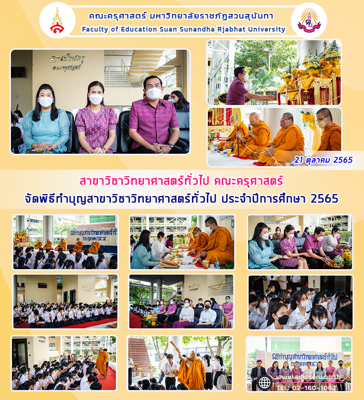 วันที่ 21 ตุลาคม 2565 เวลา 09.00 น. สาขาวิชาวิทยาศาสตร์ทั่วไป คณะครุศาสตร์ มหาวิทยาลัยราชภัฏสวนสุนันทา นำโดย ผู้ช่วยศาสตราจารย์ดร.สุมาลี เทียนทองดี หัวหน้าสาขาวิชาวิทยาศาสตร์ทั่วไป พร้อมด้วยอาจารย์และนักศึกษาในสาขาวิชาฯ จัดพิธีทำบุญสาขาวิชาวิทยาศาสตร์ทั่วไป ประจำปีการศึกษา 2565 เพื่อนเป็นสิริมงคล แก่ อาจารย์และนักศึกษา โดยมี อาจารย์วีรพจน์ รัตนวาร รองคณบดีฝ่ายบริหาร เป็นประธานในการจุดธูปเทียนพระรัตนตรัย ถวายพวงมาลัย และถวายชุดสังฆทาน แด่พระภิกษุสงฆ์ จำนวน 5 รูป ณ ลานบ้านครู คณะครุศาสตร์ มหาวิทยาลัยาชภัฏสวนสุนันทา