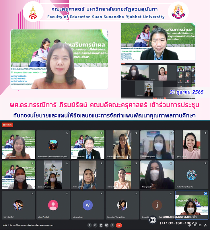 วันที่ 21 ตุลาคม 2565 เวลา 10.00 - 12.00 น. ผู้ช่วยศาสตราจารย์ ดร.กรรณิการ์ ภิรมย์รัตน์ คณบดีคณะครุศาสตร์ มหาวิทยาลัยราชภัฏสวนสุนันทา เข้าร่วมการประชุมกับกองนโยบายแผน ให้ข้อเสนอแนะการจัดทำแผนพัฒนาคุณภาพสถานศึกษา ของโรงเรียนวัดบ้านปลัดปุ๊ก โรงเรียนวัดบ้านกะหาด และโรงเรียนวัดบ้านปราสาท ผ่านระบบออนไลน์ Google Meet โดยมี ผู้ช่วยศาสตราจารย์ ธนวัฒน์ ศรีศิริวัฒน์ เป็นผู้ทรงคุณวุฒิ โดยให้สถานศึกษานำข้อเสนอเเนะไปปรับปรุงแก้ไขในการจัดทำแผนพัฒนาคุณภาพของสถานศึกษา เพื่อเตรียมความพร้อมการลงพื้นที่