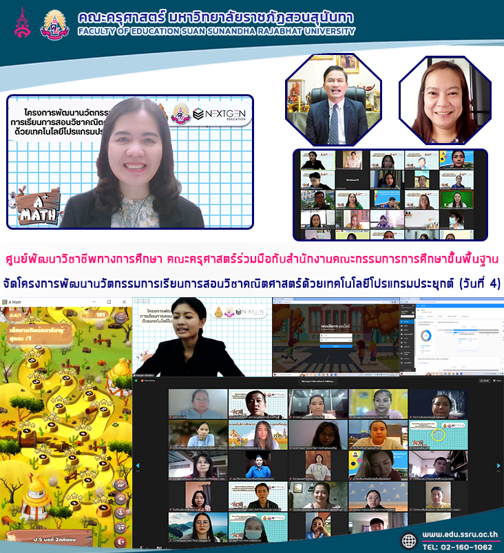 เมื่อวันที่ 20 พฤศจิกายน 2565 09.00 – 16.00 น. ศูนย์พัฒนาวิชาชีพทางการศึกษา คณะครุศาสตร์ มหาวิทยาลัยราชภัฏสวนสุนันทา นำโดย ผู้ช่วยศาสตราจารย์ ดร.กรรณิการ์ ภิรมย์รัตน์ คณบดีคณะครุศาสตร์ อาจารย์ ดร.ดวงกมล จงเจริญ ผู้อำนวยการศูนย์พัฒนาวิชาชีพทางการศึกษา อาจารย์ ดร.พัชราภรณ์ พิลาสมบัติ อาจารย์ดิษิรา ผางสง่า และนายพีรพล เชื่อมแก้ว ร่วมมือกับสำนักงานคณะกรรมการการศึกษาขั้นพื้นฐาน จัดโครงการพัฒนานวัตกรรมการเรียนการสอนวิชาคณิตศาสตร์ด้วยเทคโนโลยีโปรแกรมประยุกต์ (วันที่ 4) ในหัวข้อ "การใช้งานระบบการจัดการออนไลน์และแอปพลิเคชันแนะนำแนวทางการใช้แอปพลิเคชันในห้องเรียน" โดยได้รับเกียรติจาก ดร.ภูธร จันทะหงส์ ปุณยจรัสธรง ผู้อำนวยการสำนักพัฒนานวัตกรรมการจัดการศึกษา สำนักงานคณะกรรมการการศึกษาขั้นพื้นฐาน เป็นประธานเปิดโครงการฯ ผู้เข้าร่วมอบรม คือ ผู้บริหารสำนักงานเขตพื้นที่การศึกษา ศึกษานิเทศก์ ผู้บริหารโรงเรียน และครูผู้สอนวิชาคณิตศาสตร์ ระดับชั้นประถมศึกษาปีที่ 4-6 จากกลุ่มโรงเรียนคุณภาพ ระดับประถมศึกษา 250 โรงเรียนทั่วประเทศ ผ่านระบบออนไลน์ Zoom Meetings