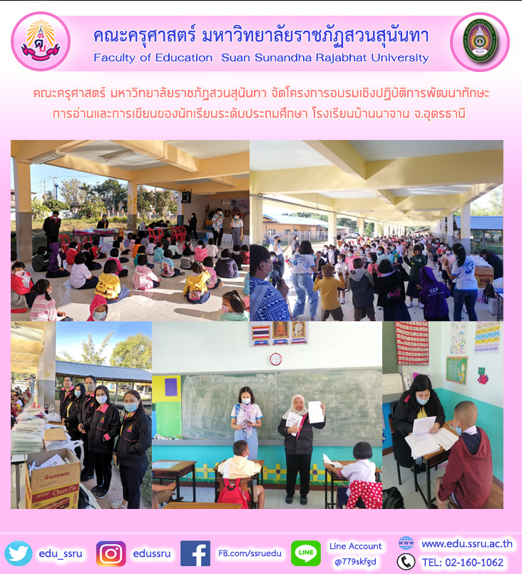 วันที่ 21 ธันวาคม 2563 คณะครุศาสตร์ มหาวิทยาลัยราชภัฏสวนสุนันทา จัดโครงการอบรมเชิงปฏิบัติการพัฒนาทักษะการอ่านและการเขียนของนักเรียนระดับประถมศึกษา ในสังกัดสำนักงานเขตพื้นที่การศึกษาประถมศึกษาอุดรธานี เขต 3 ณ โรงเรียนบ้านนาจาน ต.โพนสูง อ.บ้านดุง จ.อุดรธานี