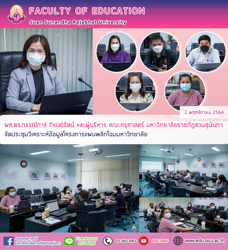 วันที่ 2 พฤศจิกายน 2564 ผู้ช่วยศาสตราจารย์ ดร.กรรณิการ์ ภิรมย์รัตน์ คณบดี อาจารย์ ดร.ธีราภรณ์ พลายเล็ก รองคณบดีฝ่ายวิจัยและบริการวิชาการ ผู้ช่วยศาสตราจารย์สงกรานณ์ ขุนทิพย์ทอง รองคณบดีฝ่ายกิจการนักศึกษา อาจารย์ ดร.ศิลป์ชัย พูลคล้าย รองคณบดีฝ่ายบริหาร และ อาจารย์ ดร.ดวงกมล จงเจริญ ผู้อำนวยการศูนย์พัฒนาวิชาชีพทางการศึกษา และเจ้าหน้าที่ฝ่ายแผนงานและประกันคุณภาพ จัดประชุมวิเคราะห์ข้อมูลโครงการแผนพลิกโฉมมหาวิทยาลัย ณ ห้องประชุม 1124 อาคาร 11 คณะครุศาสตร์