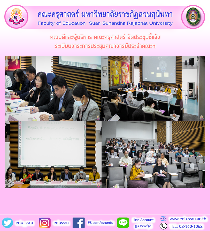 วันที่ 2 ธันวาคม 2563 ผู้ช่วยศาสตราจารย์ ดร.กรรณิการ์ ภิรมย์รัตน์ รักษาราชการแทนคณบดีคณะครุศาสตร์ มหาวิทยาลัยราชภัฏสวนสุนันทา พร้อมด้วยผู้บริหารของคณะฯ จัดประชุมชี้แจ้ง ระเบียบวาระการประชุมคณาจารย์ประจำคณะฯ และมอบกระเช้าเพื่อแสดงความยินดีแก่อาจารย์ที่สำเร็จการศึกษาในระดับปริญญาเอก ณ ห้อง 1137