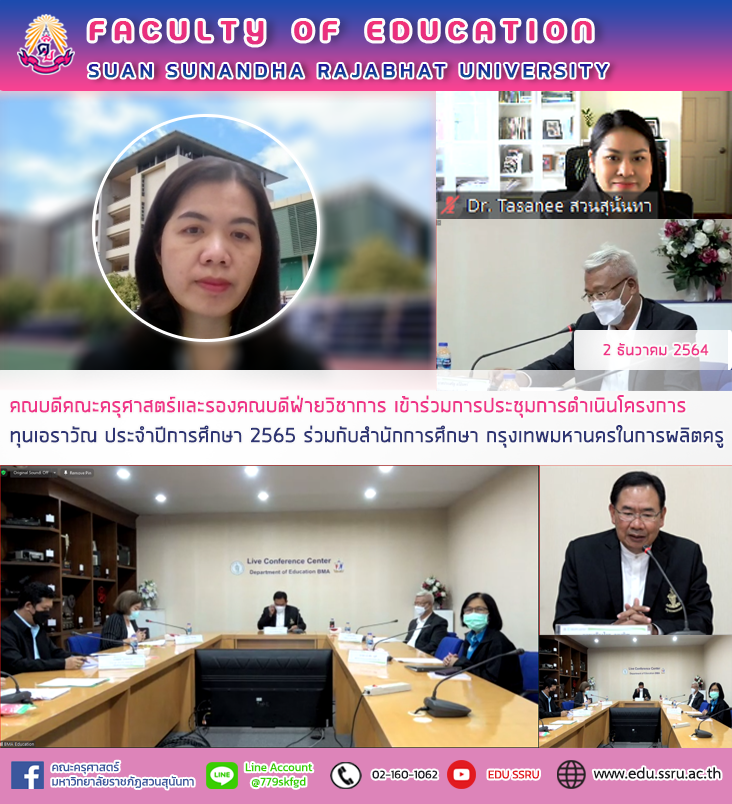 วันที่ 2 ธันวาคม 2564 ผู้ช่วยศาสตราจารย์ ดร.กรรณิการ์ ภิรมย์รัตน์ คณบดีคณะครุศาสตร์ มหาวิทยาลัยราชภัฏสวนสุนันทา พร้อมด้วย ผู้ช่วยศาสตราจารย์ ดร.ทัศนีย์ เศรษฐพงศ์ รองคณบดีฝ่ายวิชาการ เข้าร่วมการประชุมการดำเนินโครงการทุนเอราวัณ ประจำปีการศึกษา 2565 ร่วมกับสำนักการศึกษา กรุงเทพมหานครในการผลิตครู ในรูปแบบออนไลน์