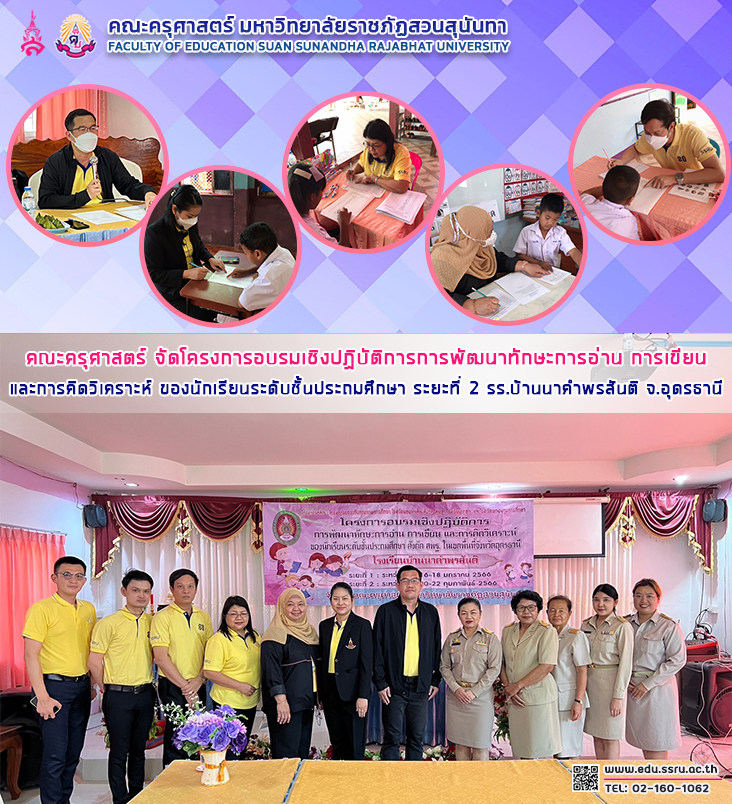 เมื่อวันที่ 20 กุมภาพันธ์ 2566 คณะครุศาสตร์ มหาวิทยาลัยราชภัฏสวนสุนันทา นำโดย อาจารย์วีรพจน์ รัตนวาร รองคณบดีฝ่ายบริหาร พร้อมกับคณาจารย์คณะครุศาสตร์ จัดโครงการอบรมเชิงปฏิบัติการการพัฒนาทักษะการอ่าน การเขียน และการคิดวิเคราะห์ ของนักเรียนระดับชั้นประถมศึกษา สังกัด สพฐ. ในเขตพื้นที่จังหวัดอุดรธานี ระยะที่ 2 ณ โรงเรียนบ้านนาคำพรสันติ จังหวัดอุดรธานี
