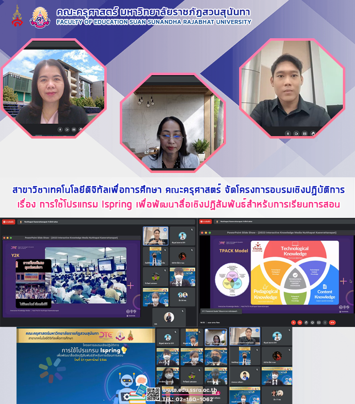 เมื่อวันที่ 21 กุมภาพันธ์ 2566 สาขาวิชาเทคโนโลยีดิจิทัลเพื่อการศึกษา คณะครุศาสตร์ มหาวิทยาลัยราชภัฏสวนสุนันทา จัดโครงการอบรมเชิงปฏิบัติการ เรื่อง การใช้โปรแกรม Ispring เพื่อพัฒนาสื่อเชิงปฏิสัมพันธ์สำหรับการเรียนการสอน โดยมี ผู้ช่วยศาสตราจารย์ ดร.กรรณิการ์ ภิรมย์รัตน์ คณบดีคณะครุศาสตร์ กล่าวเปิดโครงการ และผู้ช่วยศาสตราจารย์ ดร.ณัฐภัทร แก้วรัตนภัทร์ เป็นวิทยากรในการอบรม ผ่านระบบออนไลน์ มีนักศึกษาในการเข้าร่วมอบรมทั้งสิ้น 90 คือ นักศึกษาสาขาเทคโนโลยีดิจิทัลเพื่อการศึกษาชั้นปีที่ 2 และชั้นปีที่ 3