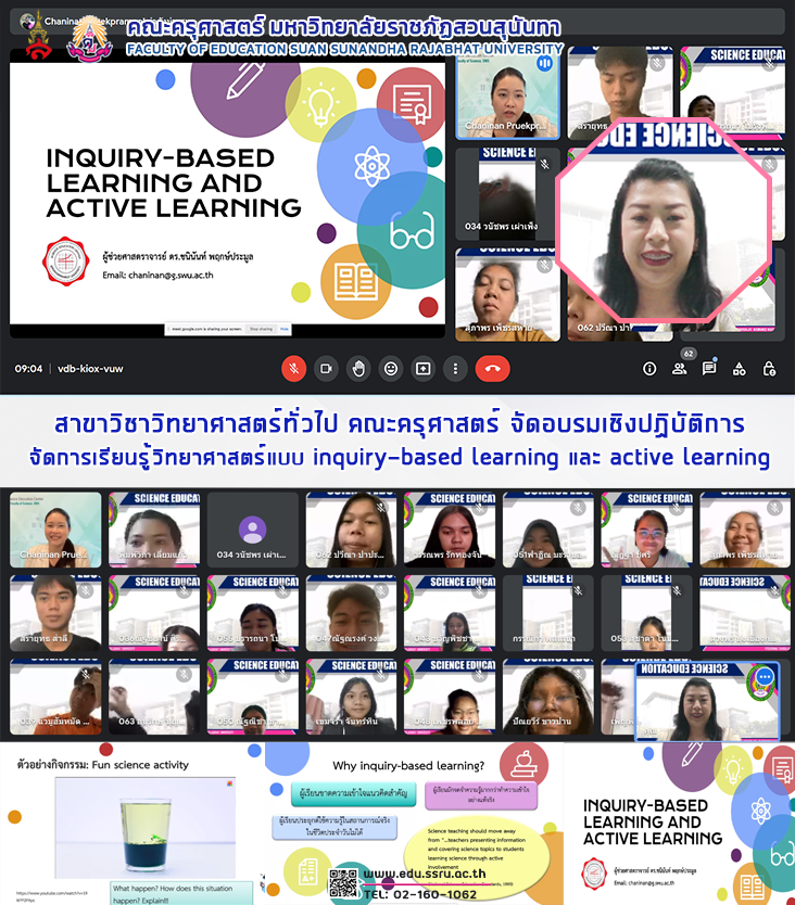 เมื่อวันที่ 20 กุมภาพันธ์ 2566 สาขาวิชาวิทยาศาสตร์ทั่วไป คณะครุศาสตร์ มหาวิทยาลัยราชภัฏสวนสุนันทา จัดการอบรมเชิงปฏิบัติการผ่านระบบออไลน์ เรื่อง การจัดการเรียนรู้วิทยาศาสตร์แบบ inquiry-based learning และ active learning วิทยากร ได้แก่ ผู้ช่วยศาสตราจารย์ ดร.ชนินันท์ พฤกษ์ประมูล จากคณะวิทยาศาสตร์ มหาวิทยาลัยศรีนครินทรวิโรฒ