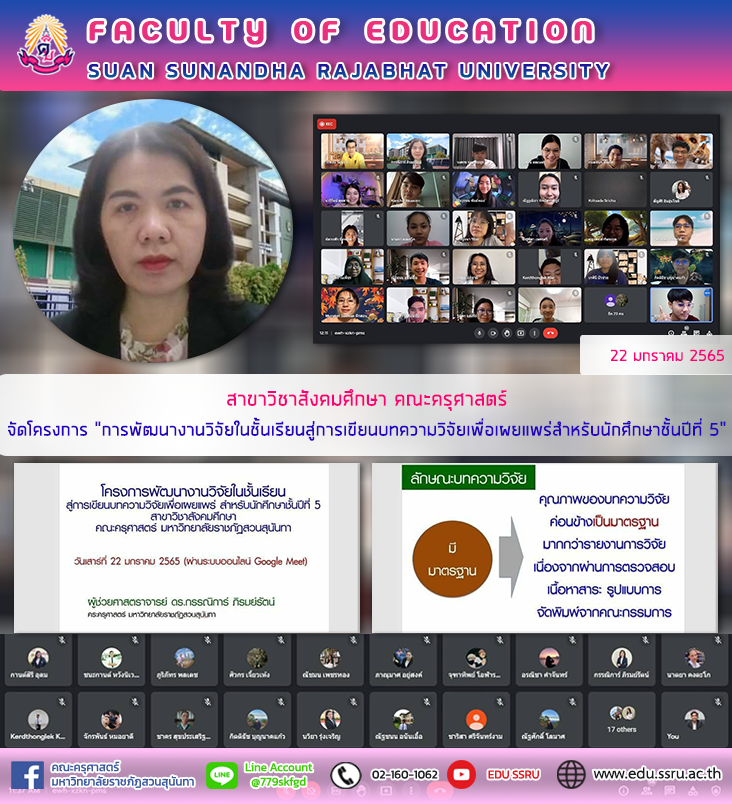 วันที่ 22 มกราคม 2565 เวลา 08.00-17.00 น. สาขาวิชาสังคมศึกษา คณะครุศาสตร์ จัดโครงการ "การพัฒนางานวิจัยในชั้นเรียนสู่การเขียนบทความวิจัยเพื่อเผยแพร่สำหรับนักศึกษาชั้นปีที่ 5" ให้กับนักศึกษาชั้นปีที่ 5 สาขาวิชาสังคมศึกษา ผ่านระบบออนไลน์ Google Meet โดยได้รับเกียรติจาก ผู้ช่วยศาสตราจารย์ ดร.กรรณิการ์ ภิรมย์รัตน์ คณบดีคณะครุศาสตร์ เป็นวิทยากรในการบรรยาย