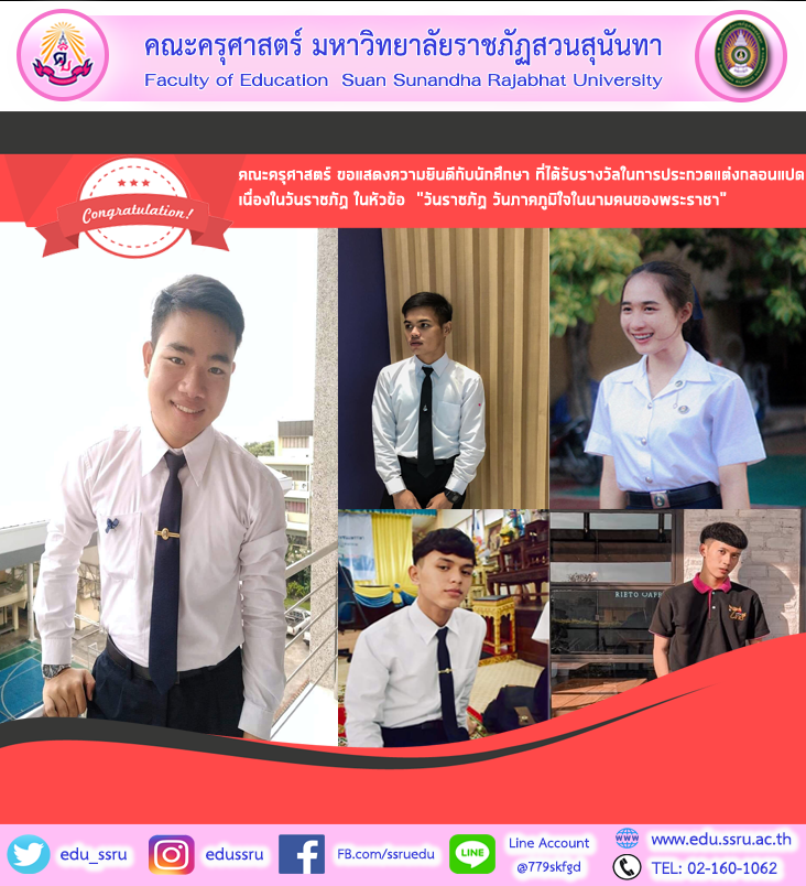 คณะครุศาสตร์ มหาวิทยาลัยราชภัฏสวนสุนันทา ขอแสดงความยินดีกับนักศึกษาที่ได้รับรางวัลในการประกวดแต่งกลอนแปด เนื่องในวันราชภัฏ ในหัวข้อ “วันราชภัฏ วันภาคภูมิใจในนามคนของพระราชา”