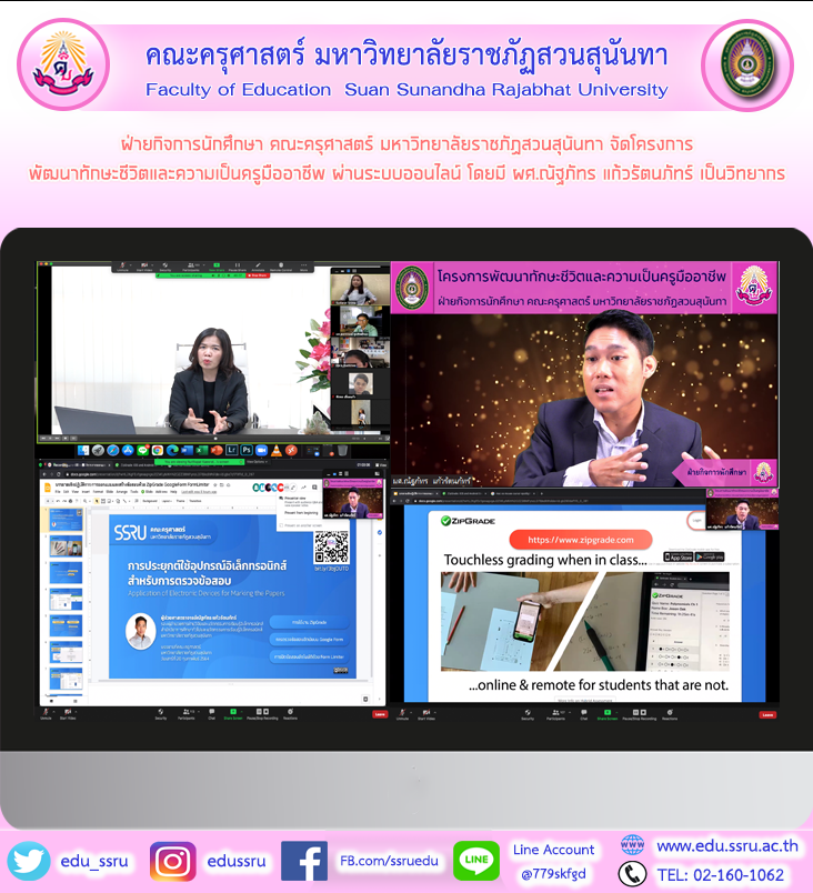 วันที่ 20 กุมภาพันธ์ 2564 ฝ่ายกิจการนักศึกษา คณะครุศาสตร์ มหาวิทยาลัยราชภัฏสวนสุนันทา จัดโครงการ พัฒนาทักษะชีวิตและความเป็นครูมืออาชีพ ผ่านระบบออนไลน์ โดยมี ผู้ช่วยศาสตราจารย์ ดร.กรรณิการ์ ภิรมย์รัตน์ คณบดีคณะครุศาสตร์ กล่าวเปิดโครงการ และผู้ช่วยศาสตราจารย์ ณัฐภัทร แก้วรัตนภัทร์ รองผู้อำนวยการฝ่ายวิจัยและพัฒนานวัตกรรมการจัดการเรียนรู้ สำนักวิชาการศึกษาทั่วไปและนวัตกรรมการเรียนรู้อิเล็กทรอนิกส์ มหาวิทยาลัยราชภัฏสวนสุนันทา เป็นวิทยากร