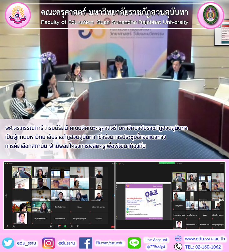 วันที่ 20 มีนาคม 2564 ผู้ช่วยศาสตราจารย์ ดร.กรรณิการ์ ภิรมย์รัตน์ คณบดีคณะครุศาสตร์ เป็นผู้แทนมหาวิทยาลัยราชภัฏสวนสุนันทา เข้าร่วมการประชุมชี้แจงแนวทางการคัดเลือกสถาบันฝ่ายผลิตโครงการผลิตครูเพื่อพัฒนาท้องถิ่น (หลักสูตรระดับปริญญาโททางการสอนในประเทศ) ผ่านระบบออนไลน์ จัดโดยสำนักงานปลัดกระทรวง อว.