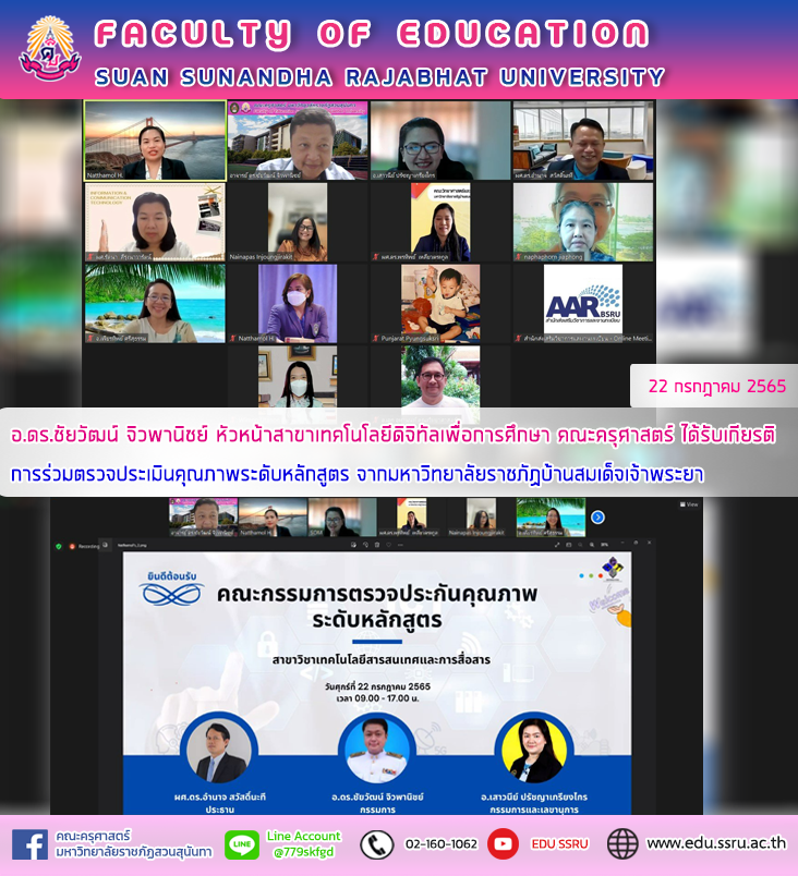 วันที่ 22 กรกฎาคม 2565 อาจารย์ ดร.ชัยวัฒน์ จิวพานิชย์ หัวหน้าสาขาวิชาเทคโนโลยีดิจิทัลเพื่อการศึกษา คณะครุศาสตร์ มหาวิทยาลัยราชภัฏสวนสุนันทา ได้รับเกียรติ จาก สาขาวิชาเทคโนโลยีสารสนเทศและการสื่อสาร มหาวิทยาลัยราชภัฏบ้านสมเด็จเจ้าพระยา ในการร่วมตรวจประเมินคุณภาพตาม กรอบมาตรฐานคุณวุฒิระดับอุดมศึกษาแห่งชาติ (มคอ.7) ระดับหลักสูตร ผ่านระบบออนไลน์ Zoom