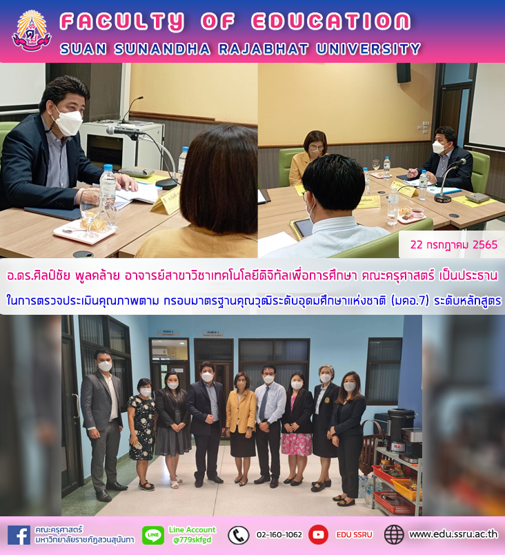 วันที่ 22 กรกฎาคม 2565 อาจารย์ ดร.ศิลป์ชัย พูลคล้าย อาจารย์สาขาวิชาเทคโนโลยีดิจิทัลเพื่อการศึกษา คณะครุศาสตร์ มหาวิทยาลัยราชภัฏสวนสุนันทา เป็นประธานในการตรวจประเมินคุณภาพตาม กรอบมาตรฐานคุณวุฒิระดับอุดมศึกษาแห่งชาติ (มคอ.7) ระดับหลักสูตร โดยได้รับเกียรติ จาก สาขาวิชาเทคโนโลยีดิจิทัลเพื่อการศึกษา คณะศึกษาศาสตร์ มหาวิทยาลัยราชภัฏจันทรเกษม
