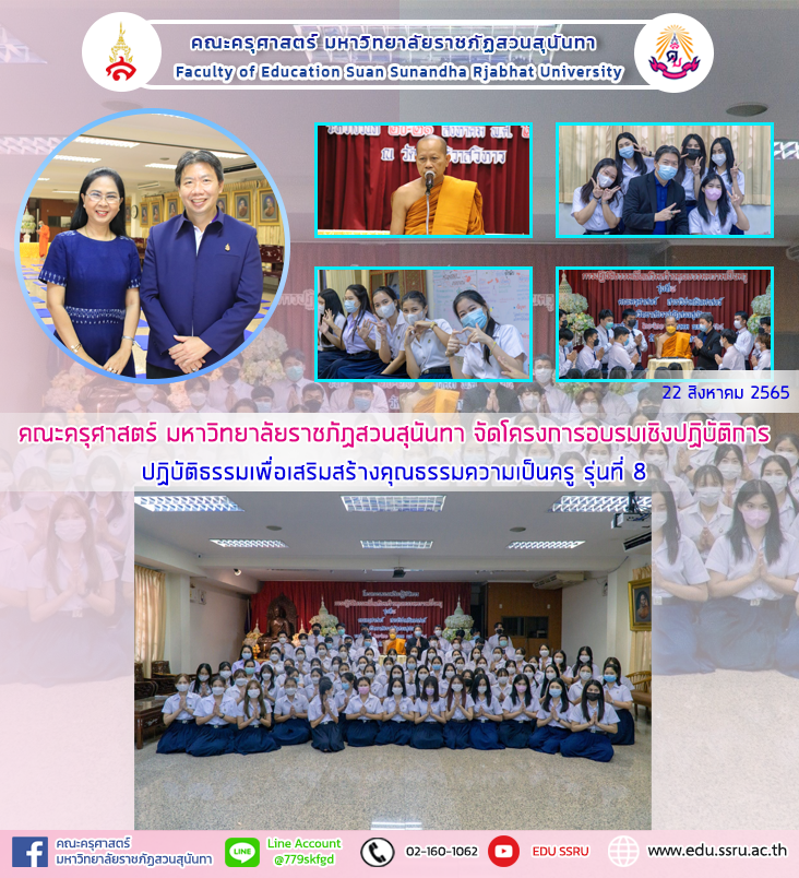 วันที่ 20 - 21 สิงหาคม 2565 นำโดย ผู้ช่วยศาสตราจารย์ธนวัฒน์ ศรีศิริวัฒน์ อาจารย์ประจำสาขาวิชาคณิตศาสตร์ คณะครุศาสตร์ มหาวิทยาลัยราชภัฏสวนสุนันทา จัดโครงการอบรมเชิงปฏิบัติการปฏิบัติธรรมเพื่อเสริมสร้างคุณธรรมความเป็นครู รุ่นที่ 8 โดยได้รับเกียรติจาก รองศาสตราจารย์ ดร.นันทิยา น้อยจันทร์ รองอธิการบดีฝ่ายวิชาการ เป็นประธานกล่าวเปิดโครงการ และ พระธรรมกวี เจ้าอาวาสวัดราชาธิวาสวิหาร เป็นพระวิทยากรในการดำเนินการกิจกรรม ณ วัดราชาธิวาสวิหาร