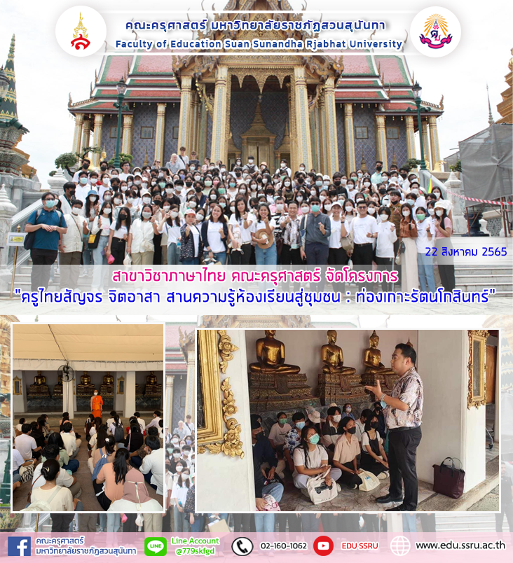 เมื่อวันที่ 20 สิงหาคม 2565 สาขาวิชาภาษาไทย คณะครุศาสตร์ มหาวิทยาลัยราชภัฏสวนสุนันทา จัดโครงการ “ครูไทยสัญจร จิตอาสา สานความรู้ห้องเรียนสู่ชุมชน : ท่องเกาะรัตนโกสินทร์” โดยได้รับเกียรติจาก อาจารย์เกียรติพงษ์ นุ่มแนบ เป็นวิทยากรบรรยายเรื่อง “ประวัติความเป็นมาของสถานที่สำคัญในวัดพระศรีรัตนศาสดารามที่ปรากฏในนิราศของสุนทรภู่” ณ วัดพระศรีรัตนศาสดาราม และบรรยายเรื่อง “ข้อมูลด้านวัฒนธรรมภาษา และวรรณดีไทยที่ปรากฏบนระเบียงรายวัดพระเชตุพนวิมลมังคลาราม” ณ วัดพระเชตุพนวิมลมังคลารามราชวรมหาวิหาร