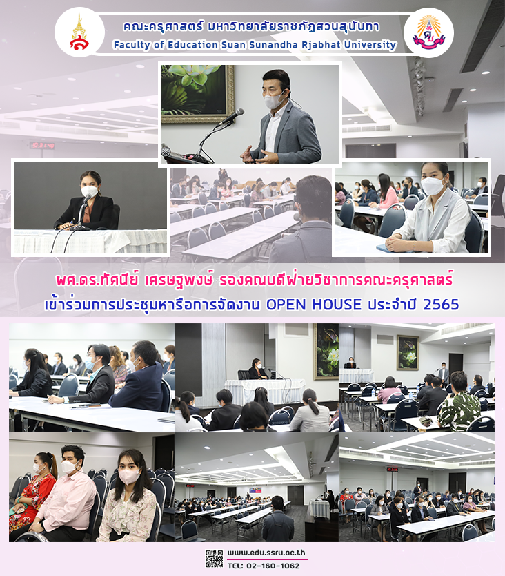 วันที่ 22 พฤศจิกายน 2565 เวลา 10.00 - 12.00 น. คณะครุศาสตร์ มหาวิทยาลัยราชภัฏสวนสุนันทา นำโดย ผู้ช่วยศาสตราจารย์ ดร.ทัศนีย์ เศรษฐพงษ์ รองคณบดีฝ่ายวิชาการ เข้าร่วมประชุมหารือการจัดงาน Open House ประจำปี 2565 โดยมี อาจารย์ ดร.ธุวธิดา สุวรรณรัตน์ ผู้ช่วยอธิการบดีฝ่ายสื่อสารองค์กร พร้อมด้วย นายศักดิ์รพี วดีศิริศักดิ์ ที่ปรึกษาด้านการประชาสัมพันธ์ นายชำนิ นิลอรุณ ผู้อำนวยการสำนักงานอธิการบดี นายนฤพล ศรีสว่าง ผู้อำนวยการกองกลาง และบุคลากรที่เกี่ยวข้องเข้าร่วมประชุม ณ ห้องประชุมช่อแก้ว ชั้น 5 อาคาร 31