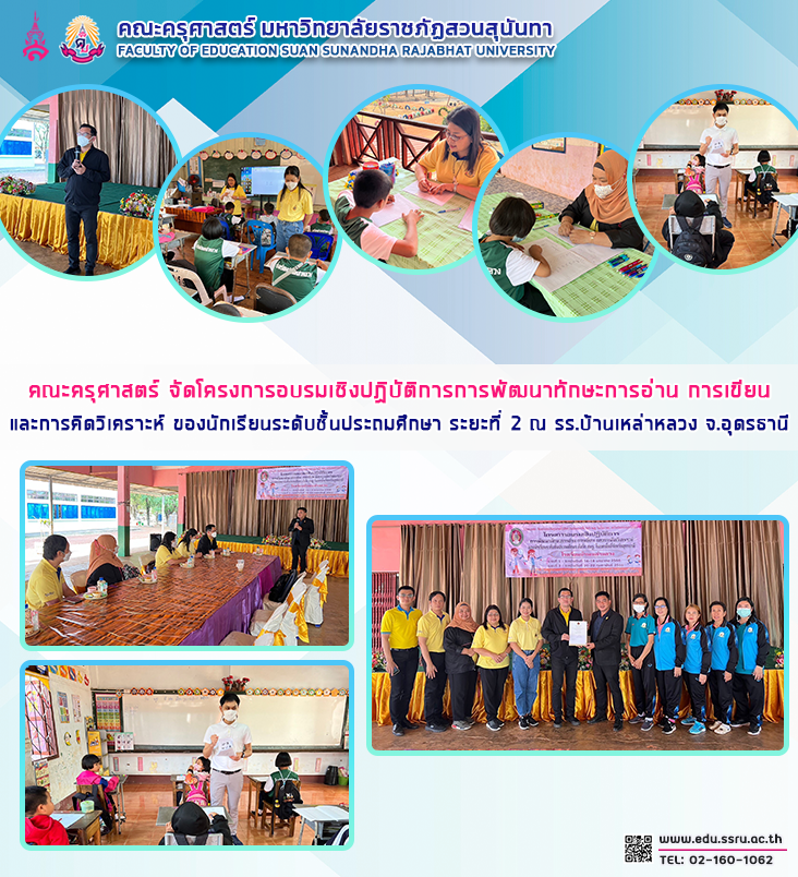 วันที่ 22 กุมภาพันธ์ 2566 คณะครุศาสตร์ มหาวิทยาลัยราชภัฏสวนสุนันทา นำโดย อาจารย์วีรพจน์ รัตนวาร รองคณบดีฝ่ายบริหาร พร้อมกับคณาจารย์คณะครุศาสตร์ จัดโครงการอบรมเชิงปฏิบัติการการพัฒนาทักษะการอ่าน การเขียน และการคิดวิเคราะห์ ของนักเรียนระดับชั้นประถมศึกษา สังกัด สพฐ. ในเขตพื้นที่จังหวัดอุดรธานี ระยะที่ 2 ณ โรงเรียนบ้านเหล่าหลวง จังหวัดอุดรธานี