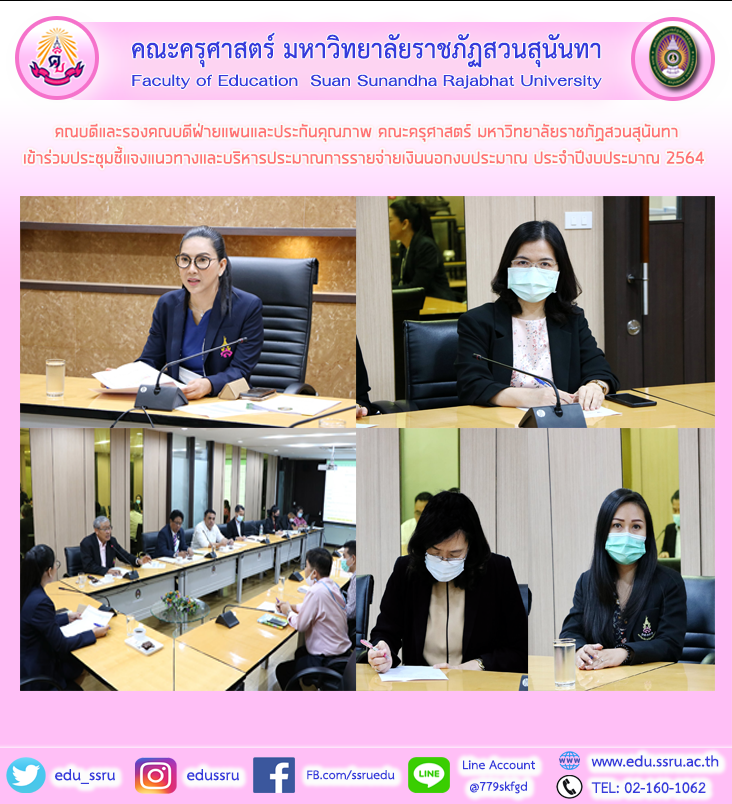 วันที่ 23 กุมภาพันธ์ 2564 ผู้ช่วยศาสตราจารย์ ดร.กรรณิการ์ ภิรมย์รัตน์ คณบดีคณะครุศาสตร์ และผู้ช่วยศาสตราจารย์ ภาวิณี โฆมานะสิน รองคณบดีฝ่ายแผนและประกันคุณภาพ มหาวิทยาลัยราชภัฏสวนสุนันทา พร้อมด้วย นางสาวภัทรพร หัสดี เจ้าหน้าที่ฝ่ายแผนและประกันคุณภาพ เข้าร่วมประชุมชี้แจงแนวทางและบริหารประมาณการรายจ่ายเงินนอกงบประมาณ ประจำปีงบประมาณ 2564 โดยมี รองศาสตราจารย์ ดร.ชุติกาญจน์ ศรีวิบูลย์ อธิการบดีเป็นประธาน ณ ห้องประชุมบรรณาศรม ชั้น 4 อาคาร 32