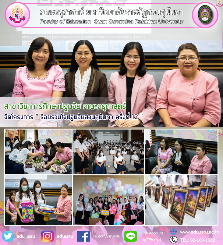 วันที่ 23 มีนาคม 2564 สาขาวิชาการศึกษาปฐมวัย คณะครุศาสตร์ มหาวิทยาลัยราชภัฏสวนสุนันทา จัดโครงการ " ร้อยรวมใจปฐมวัยสวนสุนันทา ครั้งที่ 12 " โดยได้รับเกียรติจาก รองศาสตราจารย์ ดร.นันทิยา น้อยจันทร์ รองอธิการบดีฝ่ายวิชาการ กล่าวเปิดโครงการและให้โอวาสกับนักศึกษาชั้นปีที่ 5 ที่สำเร็จการศึกษา ณ ห้อง 1137 อาคาร 11 คณะครุศาสตร์