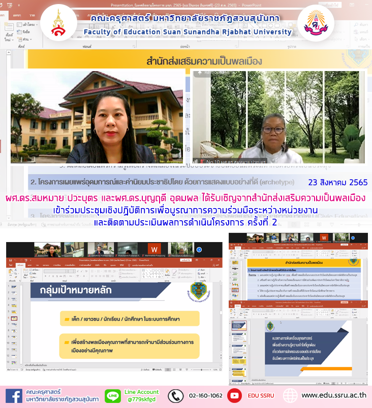 วันที่ 23 สิงหาคม 2565 ผู้ช่วยศาสตราจารย์ ดร.สมหมาย ปวะบุตร และผู้ช่วยศาสตราจารย์ ดร.บุญฤดี อุดมผล อาจารย์ประจำสาขาวิชาวิทยาศาสตร์ทั่วไป คณะครุศาสตร์ มหาวิทยาลัยราชภัฏสวนสุนันทา ได้รับเชิญจากสำนักส่งเสริมความเป็นพลเมือง สำนักงานคณะกรรมการการเลือกตั้งเข้าร่วมประชุมเชิงปฏิบัติการเพื่อบูรณาการความร่วมมือระหว่างหน่วยงานและติดตามประเมินผลการดำเนินโครงการ ครั้งที่ 2 โดยมีนายวีระ ยี่แพร รองเลขาธิการคณะกรรมการเลือกตั้งเป็นประธานในที่ประชุมซึ่งวัตถุประสงค์การประชุมในครั้งนี้เพื่อชี้แจงการขับเคลื่อนกิจกรรมการสร้างพลเมืองคุณภาพในมหาวิทยาลัยราชภัฏ ประจำปีงบประมาณ 2565 และวางแผนบูรณาการความร่วมมือในการดำเนินกิจกรรมเสริมสร้างความรู้เกี่ยวกับความเป็นพลเมืองและการมีส่วนร่วมพัฒนาประชาธิปไตยในมหาวิทยาลัยราชภัฏประจำปีงบประมาณ พ.ศ.2566 ผ่านระบบออนไลน์ Zoom