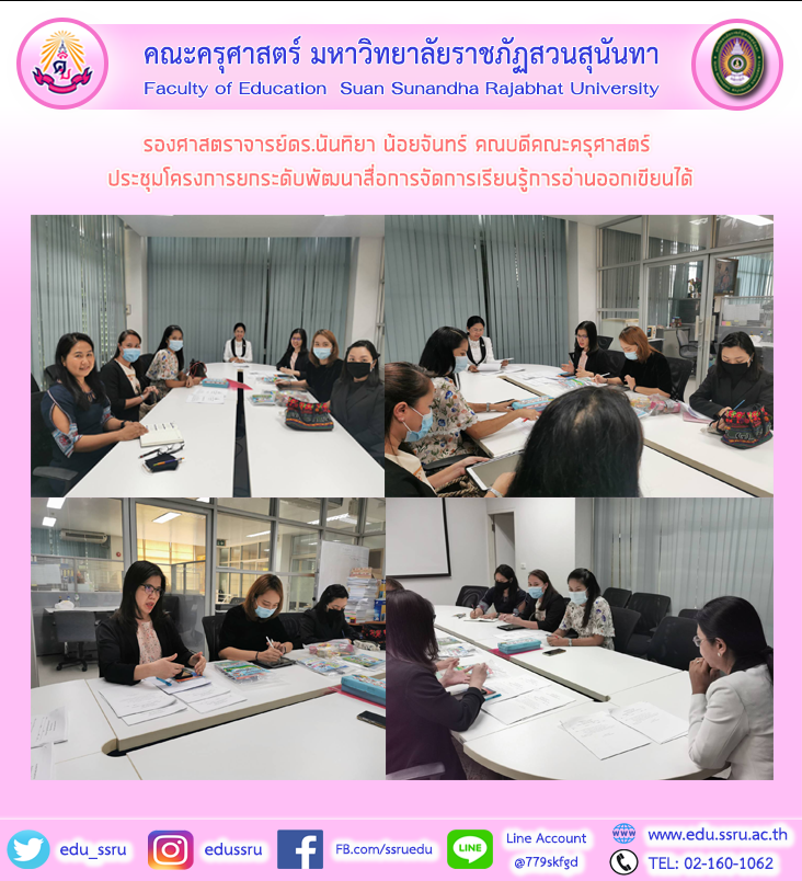 วันที่ 22 กันยายน 2563 รองศาสตราจารย์ดร.นันทิยา น้อยจันทร์ คณบดีคณะครุศาสตร์ มหาวิทยาลัยราชภัฏสวนสุนันทา ประชุมโครงการยกระดับพัฒนาสื่อการจัดการเรียนรู้การอ่านออกเขียนได้ ในระดับการจัดการศึกษาขั้นพื้นฐาน ณ ห้องประชุมกรรณาภรณ์ สำนักงานคณบดีชั้น 3 คณะครุศาสตร์ มหาวิทยาลัยราชภัฏสวนสุนันทา