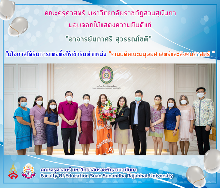 วันที่ 23 กันยายน 2565 คณะครุศาสตร์ มหาวิทยาลัยราชภัฏสวนสุนันทา นำโดย ผู้ช่วยศาสตราจารย์ ดร.กรรณิการ์ ภิรมย์รัตน์ คณบดีคณะครุศาสตร์ พร้อมด้วย ผู้ช่วยศาสตราจารย์ ดร.ทัศนีย์ เศรษฐพงษ์ รองคณบดีฝ่ายวิชาการ อาจารย์วีรพจน์ รัตนวาร รองคณบดีฝ่ายบริหาร ดร.ชัยวัฒน์ จิวพานิชย์ หัวหน้าสาขาวิชาเทคโนโลยีดิจิทัลเพื่อการศึกษา และบุคลากรของคณะฯ ร่วมมอบดอกไม้แสดงความยินดีแก่ "อาจารย์นภาศรี สุวรรณโชติ" ในโอกาสได้รับการแต่งตั้งให้เข้ารับตำแหน่ง "คณบดีคณะมนุษยศาสตร์และสังคมศาสตร์ "