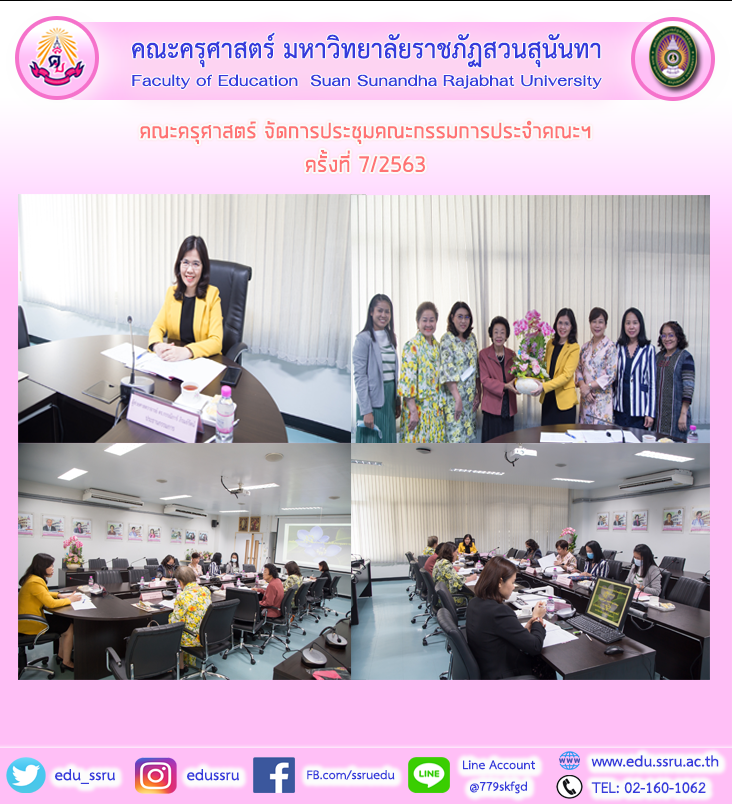 วันที่ 23 พฤศจิกายน. 2563 ผู้ช่วยศาสตราจารย์ ดร.กรรณิการ์ ภิรมย์รัตน์ รักษาราชการแทนคณบดีคณะครุศาสตร์ มหาวิทยาลัยราชภัฏสวนสุนันทา เป็นประธานกรรมการเข้าร่วมการประชุมคณะกรรมการประจำคณะฯ ครั้งที่ 7/2563 พร้อมด้วยกรรมการประจำคณะและเลขานุการ โดยมีผู้ช่วยศาสตราจารย์ ดร.เตือนใจ ทองสำริต และนางทรายทอง ตรีสัตยกุล เป็นผู้ทรงคุณวุฒิ ณ ห้องประชุม 1124 คณะครุศาสตร์