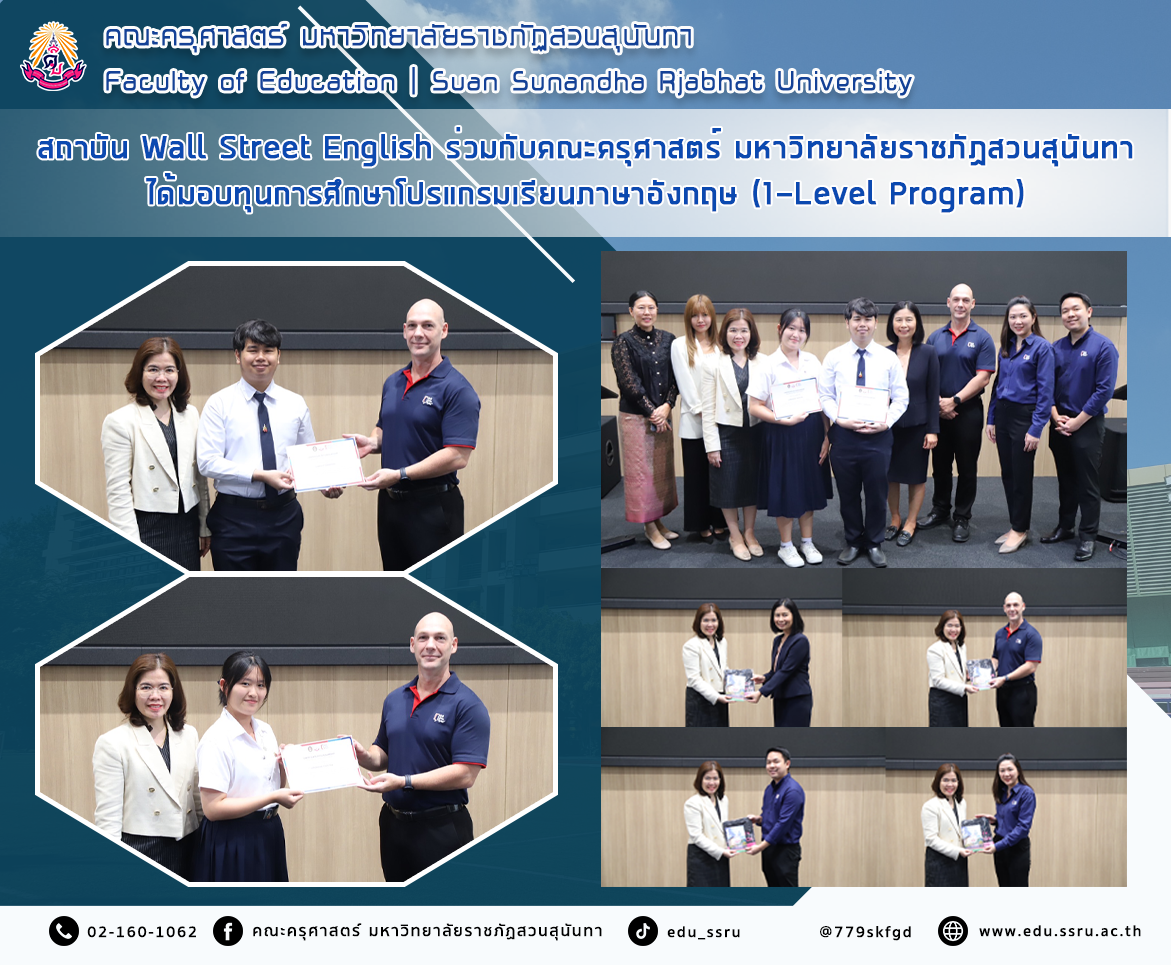 เมื่อวันที่ 20 มกราคม 2568 สถาบัน Wall Street English ร่วมกับคณะครุศาสตร์ มหาวิทยาลัยราชภัฏสวนสุนันทา ได้มอบทุนการศึกษาโปรแกรมเรียนภาษาอังกฤษ (1-Level Program) แก่นักศึกษาชั้นปีที่ 3 สาขาวิชาภาษาอังกฤษ คณะครุศาสตร์ ได้แก่ นายสรรเพชญ ทินาภรณ์ และ นางสาวกมลวรรณ ประพุทธา เพื่อส่งเสริมศักยภาพด้านภาษาอังกฤษและสนับสนุนการพัฒนาความรู้สำหรับนักศึกษาให้พร้อมสู่การเป็นครูมืออาชีพในอนาคต คณะครุศาสตร์ขอแสดงความยินดีกับนักศึกษาที่ได้รับทุนการศึกษา และขอขอบคุณสถาบัน Wall Street English ที่ให้การสนับสนุนและความร่วมมือในครั้งนี้อย่างดียิ่ง