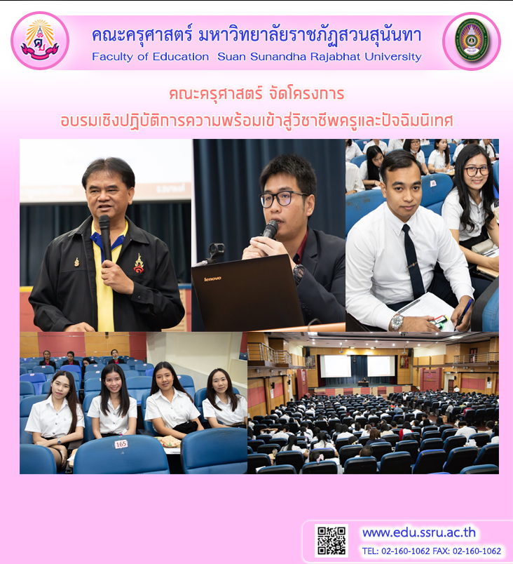 วันที่ 23 กุมภาพันธ์ 2563 คณะครุศาสตร์ จัดโครงการอบรมเชิงปฏิบัติการความพร้อมเข้าสู่วิชาชีพครูและปัจฉิมนิเทศ โดยได้รับเกียรติจาก นายธนาพงศ์ มงคลวรรณ บรรยายสังคมและเหตุการณ์ปัจจุบัน และ บรรยายการวิเคราะห์คำถามทางวิชาการ ณ หอประชุมสุนันทานุสรณ์ มหาวิทยาลัยราชภัฎสวนสุนันทา