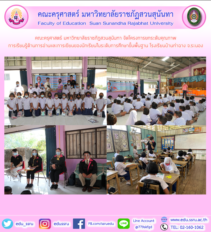 วันที่ 23 กุมภาพันธ์ 2564 คณะครุศาสตร์ มหาวิทยาลัยราชภัฏสวนสุนันทา จัดโครงการยกระดับคุณภาพการเรียนรู้ด้านการอ่านและการเขียนของนักเรียนในระดับการศึกษาขั้นพื้นฐาน โดยมี ผู้ช่วยศาสตราจารย์สงกรานณ์ ขุนทิพย์ทอง รองคณบดีฝ่ายกิจการนักศึกษา อาจารย์ ดร.สิริอร จุลทรัพย์ แก้วมรกฎ อาจารย์สุมนา เขียนนิล อาจารย์ประจำสาขาวิชาภาษาไทย ณ โรงเรียนบ้านท่าฉาง ต.หงาว อ.เมืองระนอง จ.ระนอง