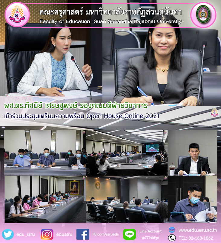 วันที่ 24 มีนาคม 2564 ผู้ช่วยศาสตราจารย์ ดร.ทัศนีย์ เศรษฐพงษ์ รองคณบดีฝ่ายวิชาการ คณะครุศาสตร์ มหาวิทยาลัยราชภัฏสวนสุนันทา เข้าร่วมประชุมเตรียมความพร้อม Open House Online 2021 ณ ห้องประชุมสภามหาวิทยาลัยราชภัฏสวนสุนันทา