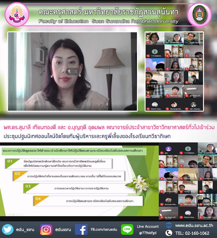 วันที่ 24 พฤษภาคม 2564 ผู้ช่วยศาสตราจารย์ ดร.สุมาลี เทียนทองดี และ อ.บุญฤดี อุดมผล คณาจารย์ประจำสาขาวิชาวิทยาศาสตร์ทั่วไป คณะครุศาสตร์ มหาวิทยาลัยราชภัฏสวนสุนันทา เข้าร่วมประชุมปฐมนิเทศออนไลน์ ซึ่งจัดโดยทีมผู้บริหารและครูพี่เลี้ยงของโรงเรียนทวีธาภิเษก สำหรับนักศึกษาฝึกประสบการณ์วิชาชีพครูจากทุกมหาวิทยาลัย