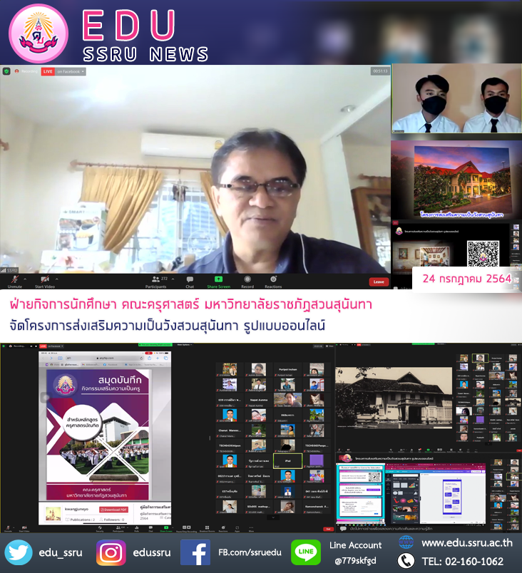 วันที่ 24 กรกฎาคม 2564 นำโดย ผู้ช่วยศาสตราจารย์ สงกรานณ์ ขุนทิพย์ทอง รองคณบดีฝ่ายกิจการนักศึกษา คณะครุศาสตร์ มหาวิทยาลัยราชภัฏสวนสุนันทา จัดโครงการส่งเสริมความเป็นวังสวนสุนันทา รูปแบบออนไลน์ และเป็นประธานกล่าวเปิด