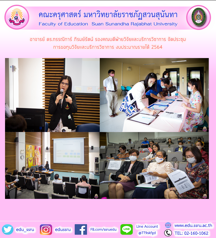 วันที่ 24 กันยายน 2563 อาจารย์ ดร.กรรณิการ์ ภิรมย์รัตน์ รองคณบดีฝ่ายวิจัยและบริการวิชาการ คณะครุศาสตร์ มหาวิทยาลัยราชภัฏสวนสุนันทา จัดประชุมชี้แจ้งแนวทางการขอทุนวิจัยและบริการวิชาการ งบประมาณรายได้ 2564 ณ ห้องประชุม 1137